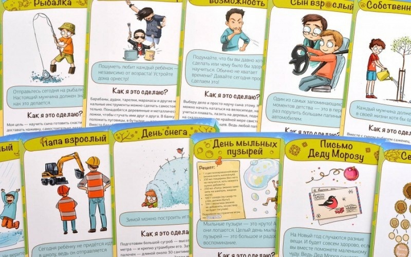 Это специальная коробка, внутри которой лежит 33 карточки с идеями приключений для папы и сына. Каждое приключение требует подготовки (иногда серьёзной, иногда совсем незначительной), и каждое становится настоящим событием в жизни ребёнка. В общем, это очень крутые карточки для родителей.