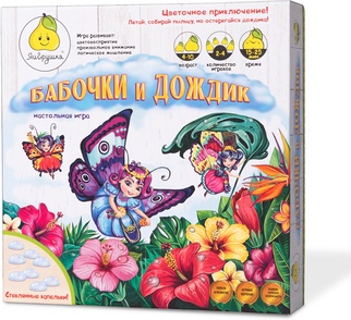 Эта игра невероятно красивая. На столе разложены цветы, по ним порхают объемные бабочки, на некоторых лепестках блестят стеклянные капельки. Задача игроков – собрать 6 разноцветных жетонов пыльцы, избегая капель и других бабочек. Если дождь попадет на лепесток, на котором уже сидит бабочка, та потеряет собранную на нем пыльцу. В игре важную роль играет не только фактор случайности, но и тактические решения. Не переживайте, очень скоро ребенок научится реализовывать хитрые логические действия.