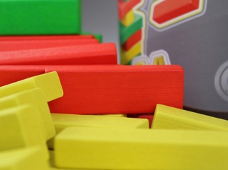 Постройте башню по схеме: 3 бруска в ряду, каждый ряд поперёк предыдущего. Затем по очереди бросайте кубик и вытаскивайте бруски выпавшего цвета, а затем кладите их на «крышу» башни так, чтобы она не разрушилась.