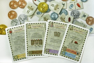 - 72 карты (65 карт персонажей (действий), 5 памяток, "Конкордия" и "Префект Магнус");