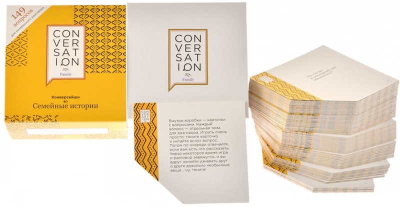 Конверсейшн: Семейные истории – семейная версия игры. Здесь Вас ждут вопросы о том, "Какое мороженое Вам кажется самым вкусным?", "Что Вас делает счастливым?", "Знаете ли Вы, как познакомились Ваши родители?". Это игра подарит Вам добрый уютный вечер, наполненный приятными воспоминаниями и позитивными эмоциями. С её помощью Вы сможете лучше понять своих детей, родителей и себя.