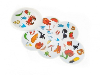5 мини-игр в 1. Игра на скорость и внимательность! Доббль. Пляж – это 31 изображение, 30 карт – и только одно единственное совпадающее изображение на двух круглых картах.