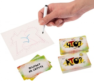 Сюжеты вам подскажут карты со словами, а чем меньше деталей окажется за контуром рамки, тем больше победных очков вы получите. Ах да, всё должно быть сделано за отведённое время. А если вам захочется отвлечься, то попробуйте второй вариант игры: возьмите колоды «Кто» и «Что» и объясняйте понятия с помощью мимики и жестов.