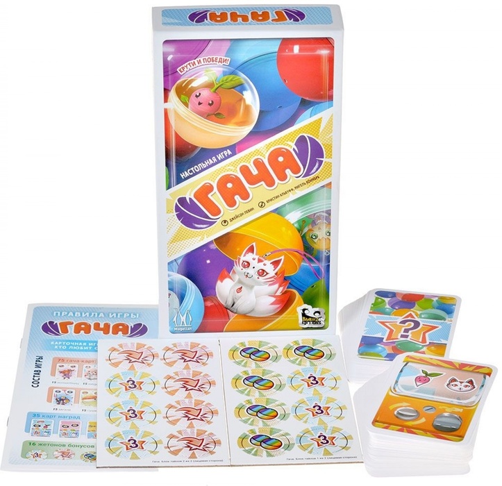 В настольной карточной игре "Гача" вы станете коллекционерами одноимённых игрушек! Какая фигурка вам достанется из аппарата: будет ли это трансформер или кицунэ? А может быть вам попадётся очень редкое позолоченное суши? Как бы то ни было, постарайтесь собрать наиболее ценную коллекцию фигурок и получите за неё наибольшее количество очков!