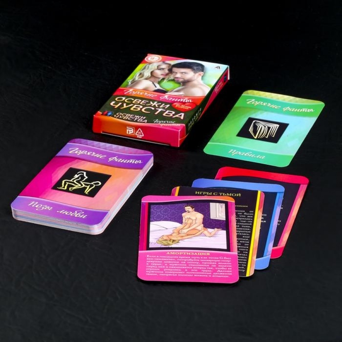 В карточках «Для неё» вы найдёте задания, способные до предела возбудить желание партнера. Колода «Для него» таит в себе секреты наслаждения для партнерши. Карты «Позы любви» — это невероятные описания сексуальных позиций, сопровождающиеся откровенными иллюстрациями. А на сладкое мы приготовили колоду «Ролевые игры» — с ней вы подарите друг другу новые эмоции и ощущения.