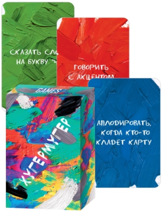 Хугермугер — это игра по правилам, но без правил. Карточки шлёпаются одна на другую, задания сменяют друг друга, сочетаются, взаимно уничтожаются. Говорить с акцентом! Издавать звуки животных! Улыбаться! Играть без рук!.. Это сумасшествие подойдет для абсолютно любой компании дома, на природе и в гостях — было бы только чувство юмора.