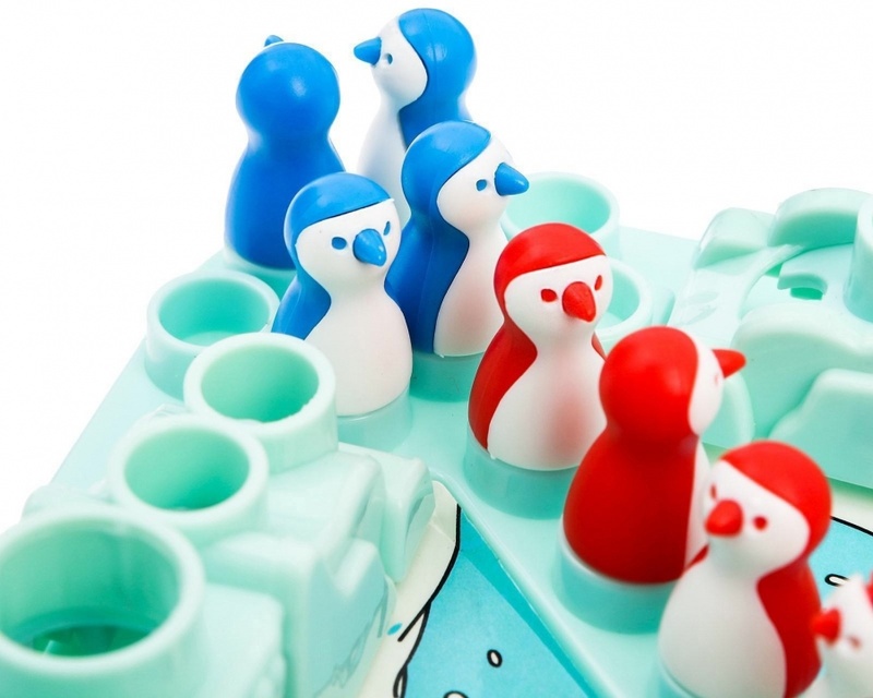 Соберите игровое поле по инструкции, выберите себе семью пингвинов и поставьте их в угол на 4 ячейки. Далее игроки ходят по очереди: кидают кубик и передвигают одного пингвина за ход на столько ячеек по часовой стрелке, сколько выпало на кубике. Потом ход переходит к следующему игроку.