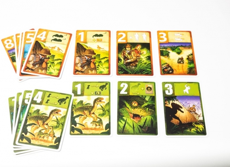 Перед партией оба игрока получают по 9 карт действий, пронумерованных от 1 до 9. Карты учёных позволяют перемещаться по парку на джипе, «возводить» стены огня, использовать усыпляющий газ и вызывать подмогу, а карты раптора — подзывать детёнышей к матери, тушить огонь или прятаться в кустах.