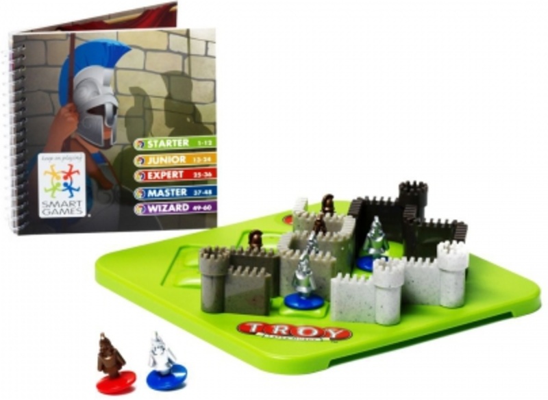 Вам предстоит почувствовать себя настоящим жителем Трои, укреплять и охранять стены города, защищаться от нападения врагов. На поле, которое состоит всего из 16-ти клеток, находятся отверстия для стен и воинов. Выбрав карточку с заданием, участник должен расположить рыцарей так, как указано в задании. Фигурки воинов красного цвета – это враги, а синего – троянцы. В игре «Троя» имеются 4 уровня сложности. Правильное решение головоломки можно найти в конце книжки, в которой собраны все увлекательные задания.