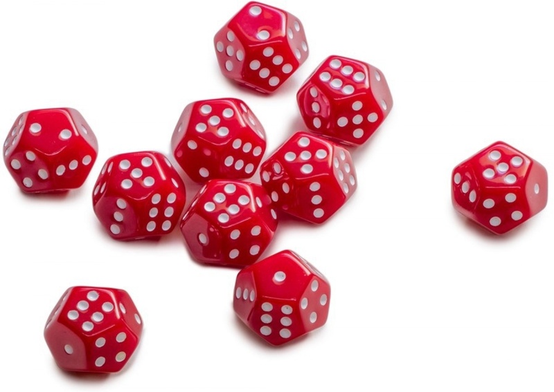 Набор из десяти додекаэдров в фирменных цветах «Студии 101», которые подойдут для любой игры, где используются кубики.