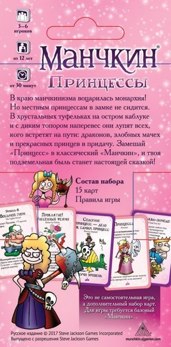 В краю манчкинизма воцарилась монархия! Но местным принцессам в замке не сидится. В хрустальных туфельках на остром каблуке и с диким топором наперевес они лупят всех, кого встретят на пути: драконов, злобных мачех и прекрасных принцев в придачу. Замешай Принцесс в классический Манчкин, и твоя подземельная быль станет настоящей сказкой!