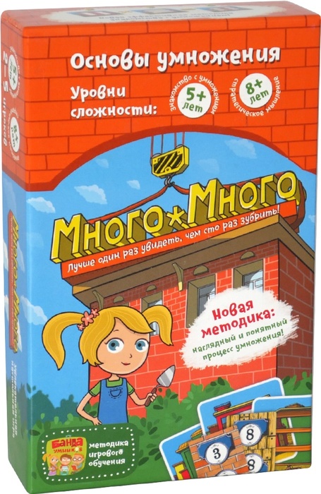 Игра "Много-много" посвящена части таблицы умножения до 5*5=25 (максимальное количество «окошек» на одной карточке — 5), и помогает освоить саму концепцию арифметической операции "умножение", сформировать визуальное представление этого действия. С опорой на это ребёнку будет проще освоить остальную часть таблицы любым способом. Не думайте, что такая лёгкая тема заставит вас скучать при игре с ребёнком один на один: продуманная игровая механика делает игру интересной даже для взрослой компании.