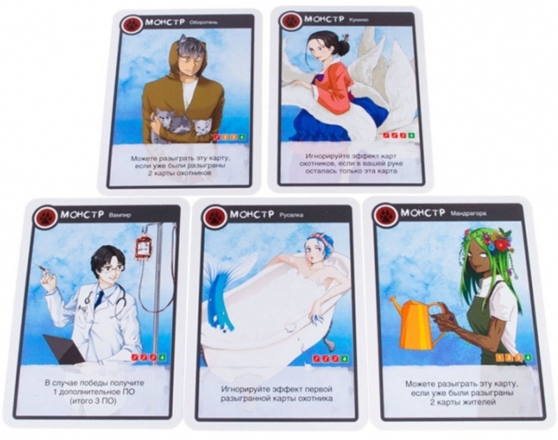 Один из игроков - монстр, а среди остальных скрываются охотники. Сможете ли вы определить, кто есть кто? Поскольку игроки обмениваются картами, роль монстра может постоянно переходить от одного игрока к другому. Сейчас вы охотник, который пытается поймать монстра, а уже в следующий ход — в шкуре монстра скрываетесь от охотников.
