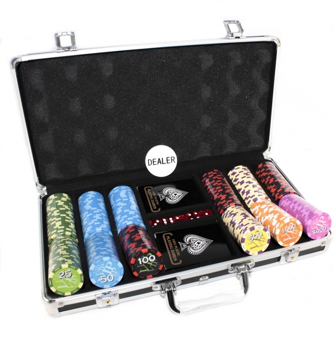 Улучшенный алюминиевый кейс с отделкой эко-кожей. Внутри кейс усилен деревянными распорками, в которые удобно укладываются покерные фишки. 300 премиум фишек по 14 грамм. Грани каждой фишки обработаны вручную. При производстве данных фишек используется более дорогой и яркий пластик. Сумма номиналов: 150 000.