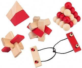 Внутри коробки находится пять не похожих друг на друга головоломок: крест, пирамида, сферы, планки и узел. Головоломки упакованы в красочную коробочку, и отлично подходят для подарка детям и взрослым.