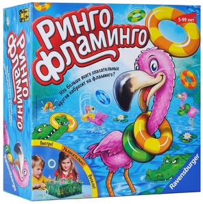 «Ринго Фламинго» — простая и очень веселая настольная игра от Ravensburger для детских компаний. Ребятам предстоит использовать свою ловкость и меткость, чтобы поймать как можно больше розовых фламинго.