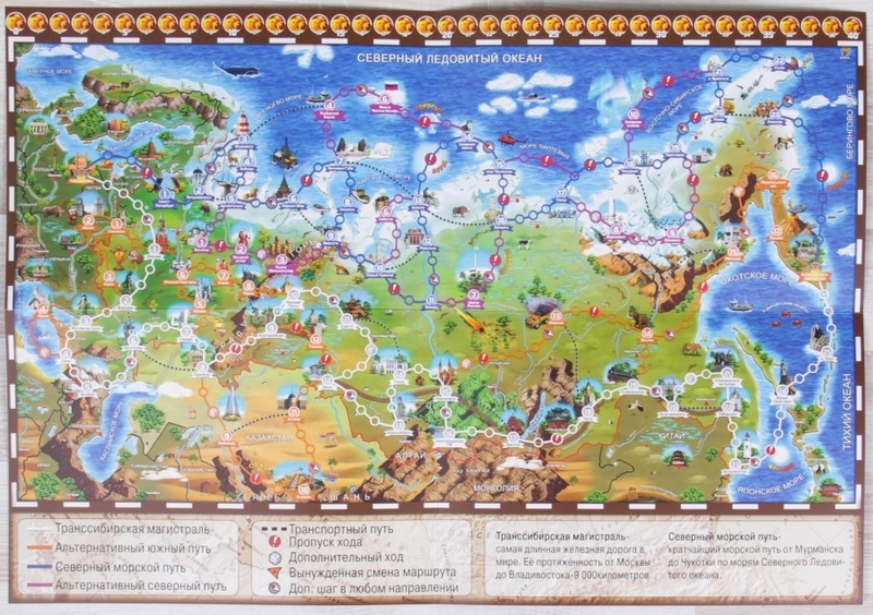 В этой игре-ходилке в качестве игрового поля выступает карта России и сопредельных государств. Игрокам предстоит совершить путешествие из Калининграда в Петропавловск-Камчатский. При этом можно выбрать один из двух основных маршрутов Северный морской путь или Транссибирскую магистраль.