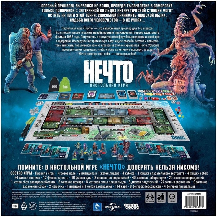 Нечто. Настольная игра – это полукооперативный триллер по мотивам культового фильма ужасов Джона Карпентера. Создатели игры стремятся как можно ярче передать атмосферу паранойи и отчаяния, царящие на станции "Аванпост-31". Одному игроку предстоит взять на себя роль пришельца и постараться улететь со станции, остальным – не дать ему это сделать, вооружившись огнемётами, коктейлями Молотова и другими интересными аксессуарами.