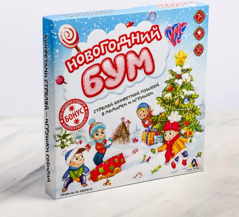 Стреляй конфетной пушкой в подарки и игрушки! Разделитесь на 2 команды. Сложите из карточек игровое поле и вырежьте картонные конфетки. А затем склейте пушку-катапульту. Запускайте «снаряды» на поле так, чтобы они попали на нужные карточки, и собирайте украшения для своей ёлки. А если ваша конфета улетела мимо, вытягивайте карточки с весёлыми фантами.