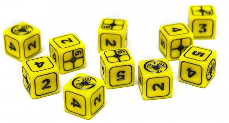 10 фирменных 16-мм игральных костей производства Fria Ligan (Ningbo Eastar Game Manufacturing Co.), дизайн создан специально для игры «Чужой», но кубики можно использовать и для любых других игр с d6.