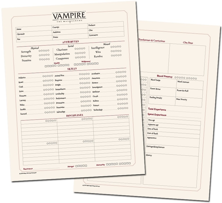 Настольная ролевая игра Вампиры: Маскарад. Пятая редакция. Набор бланков