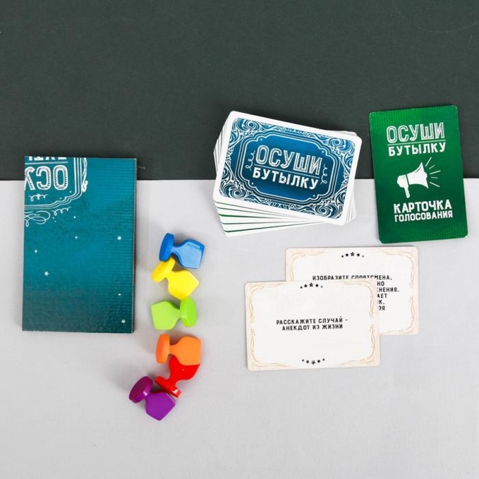 Невероятно весёлая игра! Вы спросите, почему? Да потому что в ней нужно двигаться, выполнять безумно смешные задания и, конечно же, выпивать! Игровое поле здесь оформлено в виде бутылки. Вот её-то вам и нужно осушить, пройдя от старта до финиша. Вас ждут задания-фанты, выполнив которые, свой голос нужно будет отдать лучшему игроку. А вот в случае, если кто-то из участников не справится с заданием, он должен будет выпить «штрафную». Каждому сектору поля соответствует количество алкоголя, которое должно находиться в «штрафной» рюмочке.