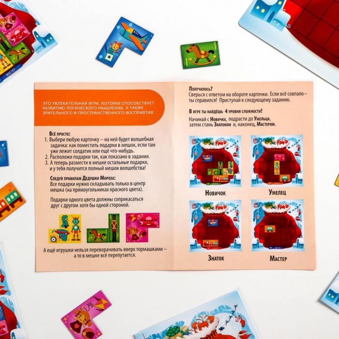 Вы получите карточку с заданием от Дедушки. В набор входит магнитное поле и детали с изображением игрушек. Поместите их на поле так, как сказано в задании. А теперь попробуйте расположить остальные части головоломки, чтобы они не выходили за контур мешка, а детали одного цвета находились рядом. Вот такая увлекательная задачка!