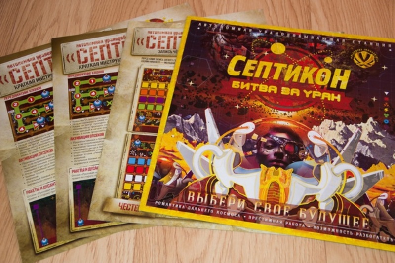 В коробке с настольной игрой Септикон вы найдете все необходимое, чтобы провести бой между станциями с вашим другом, подругой или просто хорошим человеком. Внутри лежит складное поле с двумя станциями, огромный пакет разноцветных деревянных кубиков, которые в игре являются ресурсами, набор миплов, которые служат на Септиконе клонами, а также 2 миленьких кубика для каждого игрока.