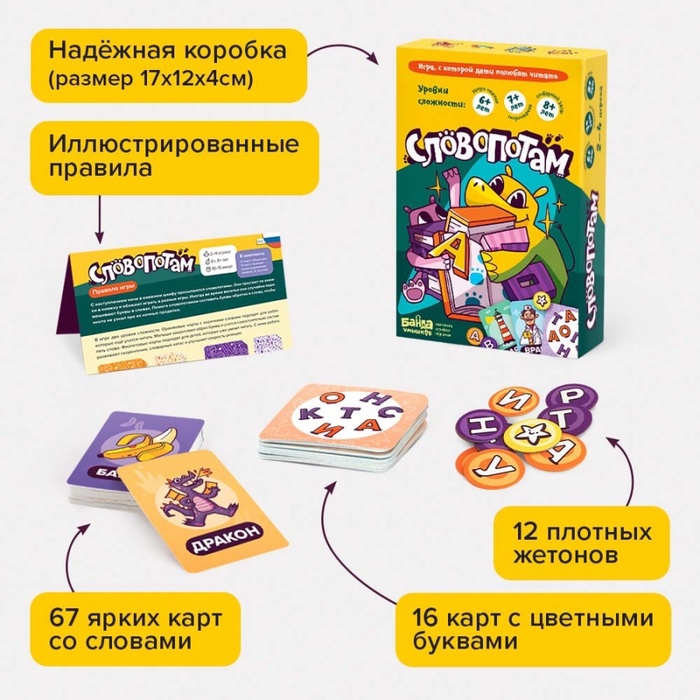 «Словопотам» поможет поддержать ребёнка на самом старте и вдохновить его на первые успехи в чтении. Игра развивает естественное любопытство и соревновательный дух ребёнка: чтобы победить, нужно сложить из букв как можно больше слов. Разные уровни сложности позволяют играть, даже если ребёнок не знает всех букв.