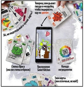 Soviet kitchen (Советская Кухня) – это карточная игра с приложением для iOS / Android, где вы сканируете карты ингредиентов, забросывая их в мясорубку на экране вашего смартфона!Ваша задача – получать из самых странных ингредиентов блюдо подходящего цвета. Вас ждёт Режим Кампании из 22 миссий, а также несколько вариантов игры в Режиме Испытаний, включая колодостроительный вариант игры (для опытных игроков). Правила можно не читать: приложение само всё подскажет прямо по ходу игры!