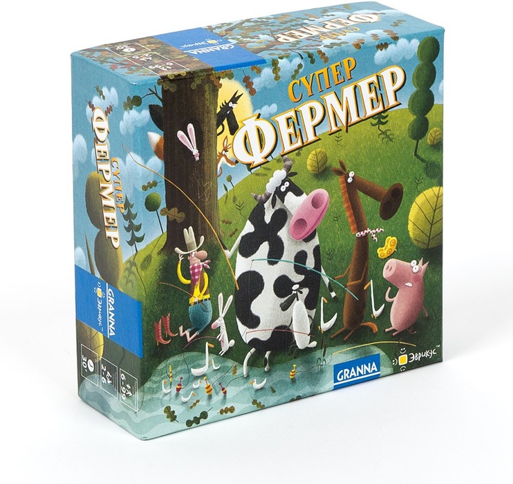 "Суперфермер" - это игра о разведении животных для детей от 6-ти лет от 2-х до 6-ти игроков. Участники возьмут на себя роль фермеров, борющихся за звание Суперфермера, путем бросания кубиков и получения жетонов животных. Игра тренирует устный счет и учит детей основам экономики. Компактность компонентов позволяет взять игру с собой в дорогу.