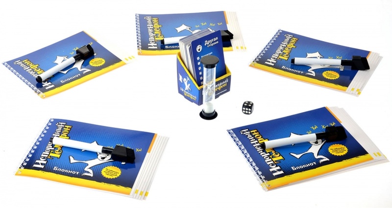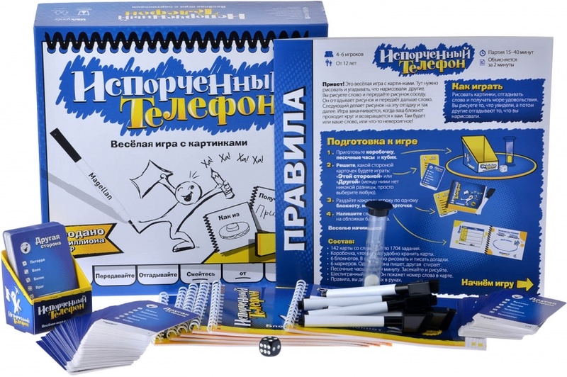 В комплекте вы найдете множество карточек с заданиями, блокноты и маркеры. Не удивляйтесь, если самолет превратится в орла, а солист в статую Свободы, в этой игре постоянно случаются казусы. Первому игроку нужно нарисовать слово из карточки и передать следующему участнику. Тот пишет слово, которое, по его мнению, нарисовал первый игрок, и дальше передает блокнот. Чередование рисуй-отгадывай-рисуй продолжается до тех пор, пока блокнот не попадет в руки первого игрока. Если вы отлично понимаете друг друга и хоть немного умеете рисовать – все может закончиться успехом, а если нет – смех сквозь слезы и приступаем к следующей партии. Во втором издании исправлены ошибки и отредактированы правила, удалены повторяющиеся слова. Одним словом, игра стала совершеннее.