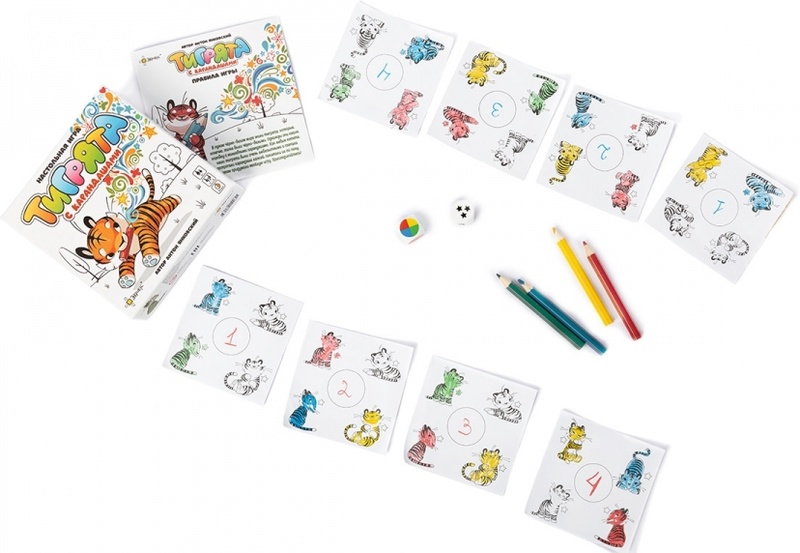 Тигрята с карандашами — это весёлая настольная игра воображение и скорость реакции, в которой участникам предлагается на время раскрасить тигрят в разные цвета, а также выполнять небольшие задания, наподобие подсчёта выпавших тигрят.