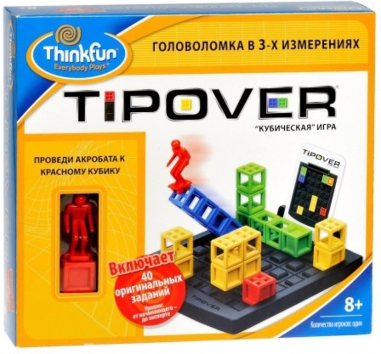Настольная игра-головоломка "Tipover" включает в себя игровое поле, 17 разноцветных кубических элементов, фигурку акробата и 40 карточек с заданиями. Ваша задача - расположить башни так, как показано на карточке с заданием, а затем опрокидывать их так, чтобы фигурка акробата оказалась на красном кубике, не коснувшись игрового поля.