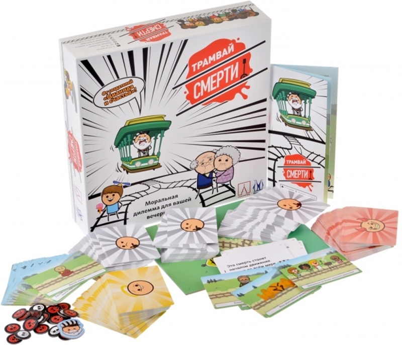 Игроки в настольной игре "Трамвай смерти" делятся на две команды и стрелочника. Участники противоположных отрядов выкладывают на свои пути добряков, негодяев и особый секрет, который может разоблачить хорошего персонажа или оправдать злодея. Когда все персонажи уже на рельсах, команды любыми доводами уговаривают стрелочника пустить состав по дороге следования противника. После того как ведущий выбрал для себя меньшее зло, проигравшие игроки берут жетон смерти. У кого к концу игры их будет меньше всего, тот и победил. Все за игру успеют побывать в роли ведущего. У руля трамвая смерти будет каждый!