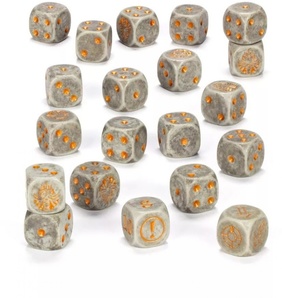 Набор из 20 кубиков отлитых из каменно-серого пластика с золотыми метками и эмблемой Горных Дворфийских Твердынь на гранях шестерок.