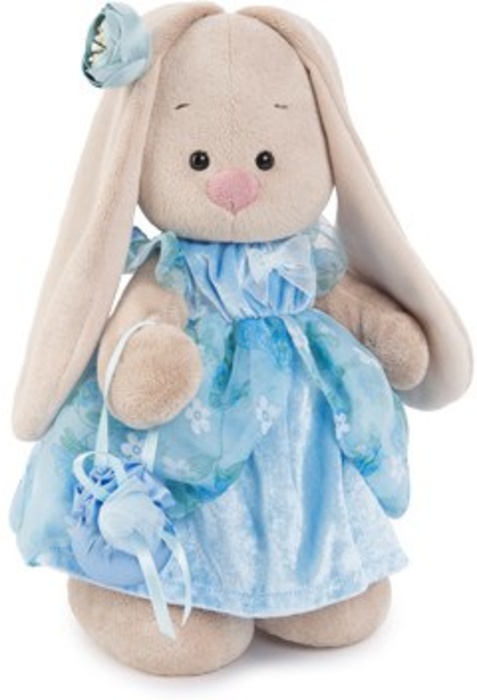 Милые аксессуары в виде оригинального нераскрывшегося цветка на ушке и голубой бархатной сумочки с атласными лентами идеально дополняют неповторимый образ длинноухой красавицы.